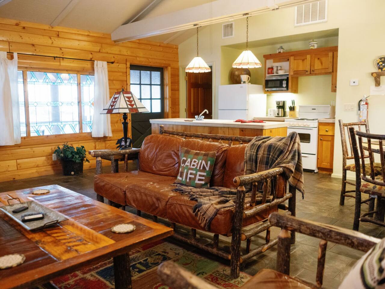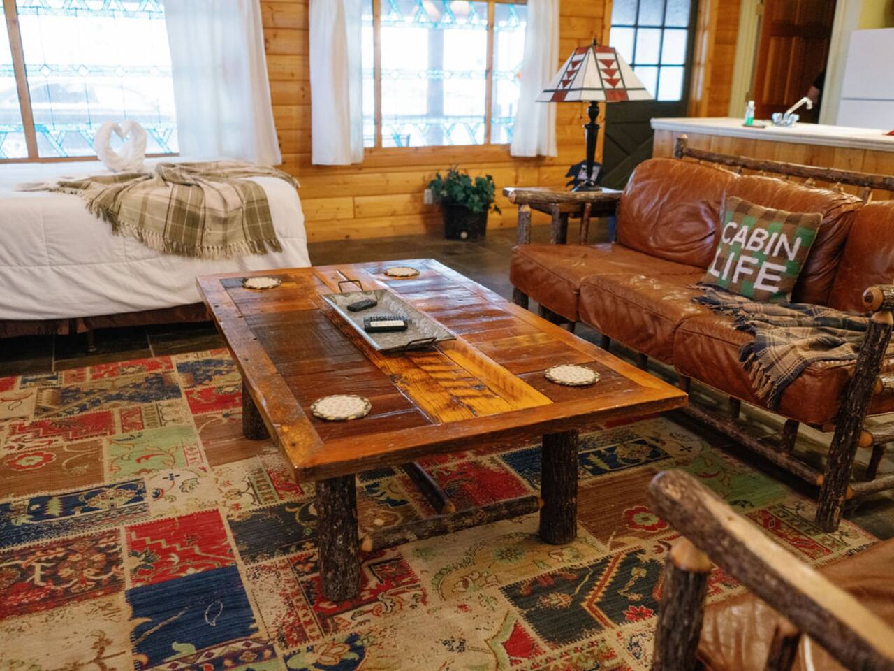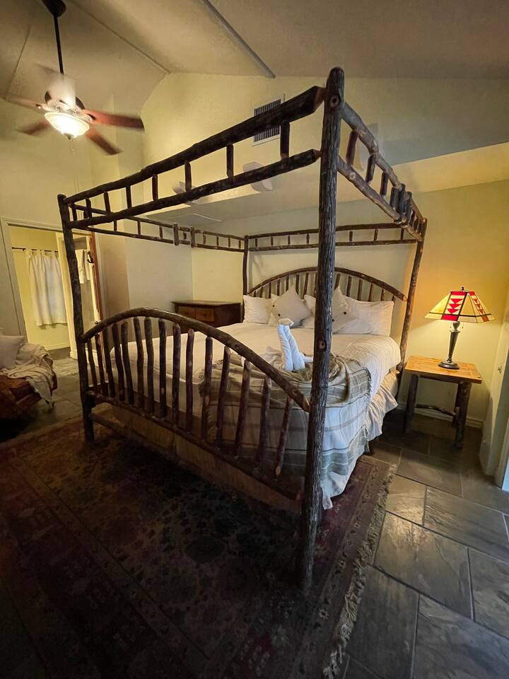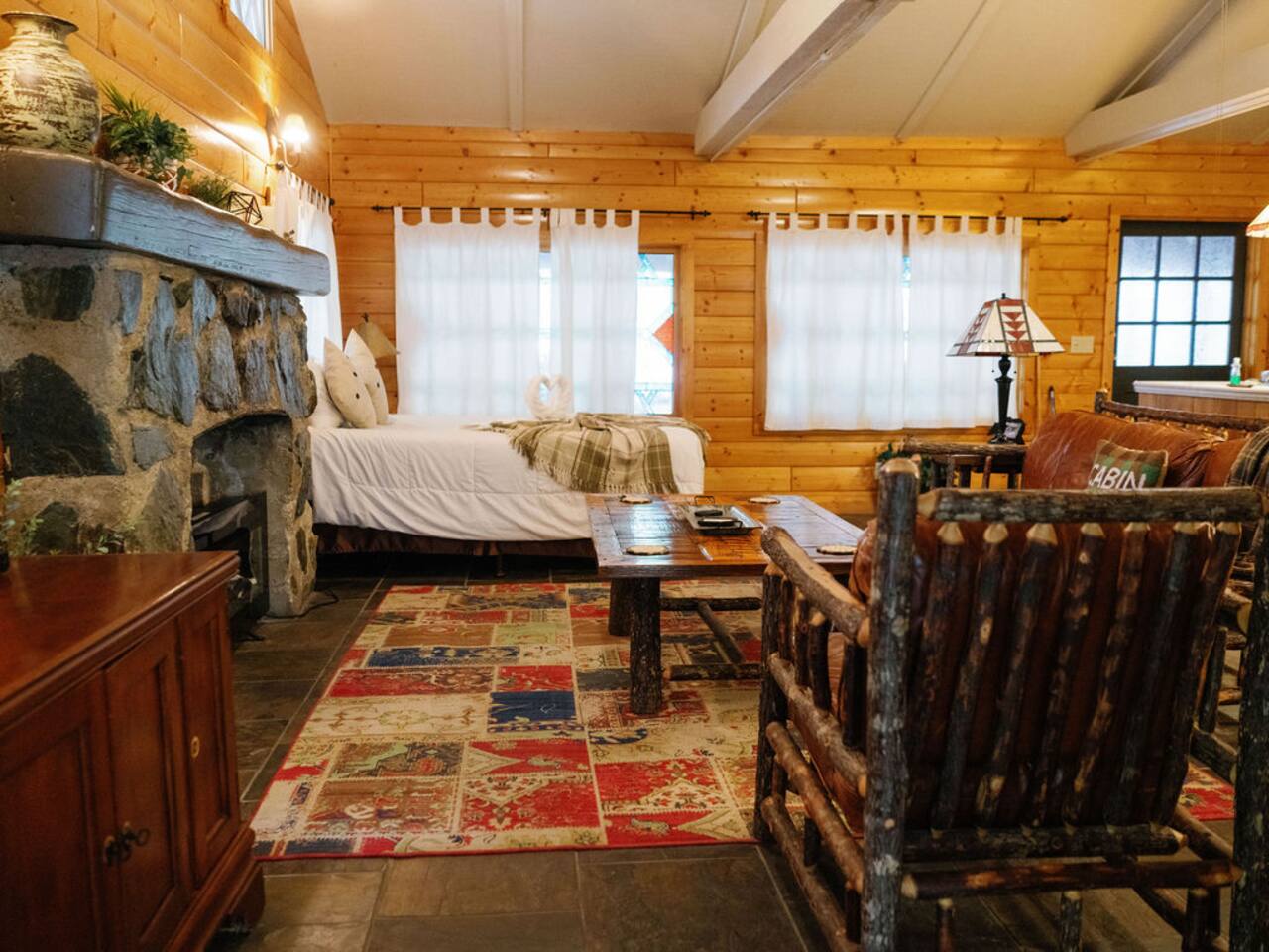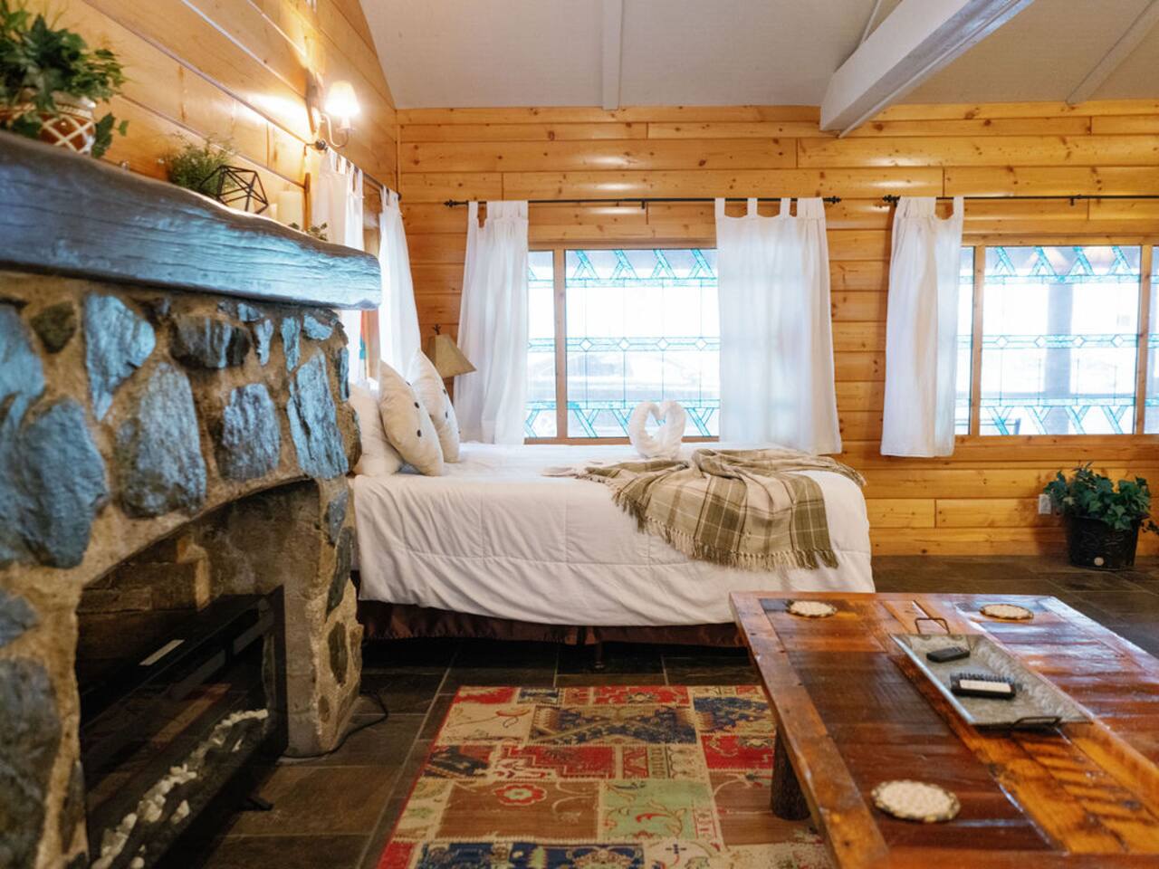Miner James D. Savage established a bona fide trading post just outside Yosemite Valley near El Portal back in 1849. These days, wonderfully rebooted, it serves as a unique vacation property, which is ideal for families, friends, and couples. The lovely Log Cabin is a cozy one-bedroom cabin ideal for honeymooners or those who want a romantic getaway— or for a writer finishing a book or memoir, actually. The spacious one-bedroom cabin sits right along a flowing river and includes a prominent living room, kitchen, dining area, Jacuzzi tub, and more. There is also a queen bed in the open space. The Log Cabin at Savages is designed for cozy comfort after a fun day in nature. Note: We use Starlink for WiFi. Due to our remote location WiFi is not always reliable.