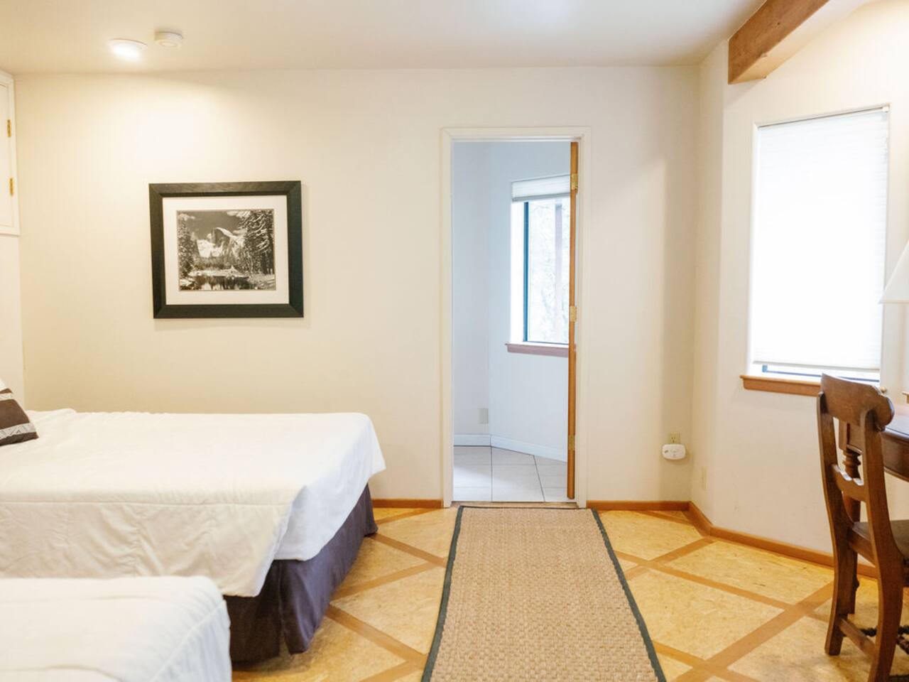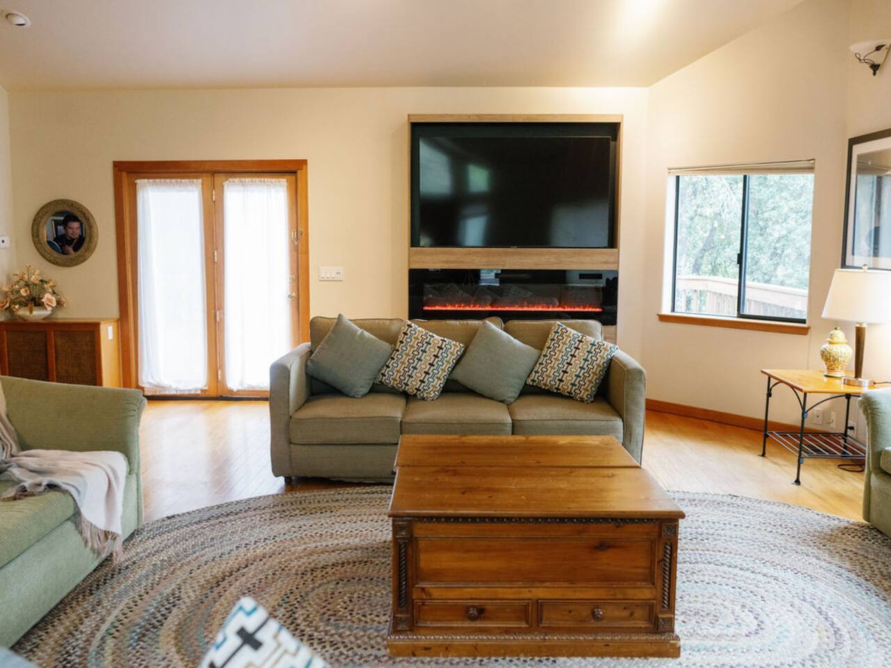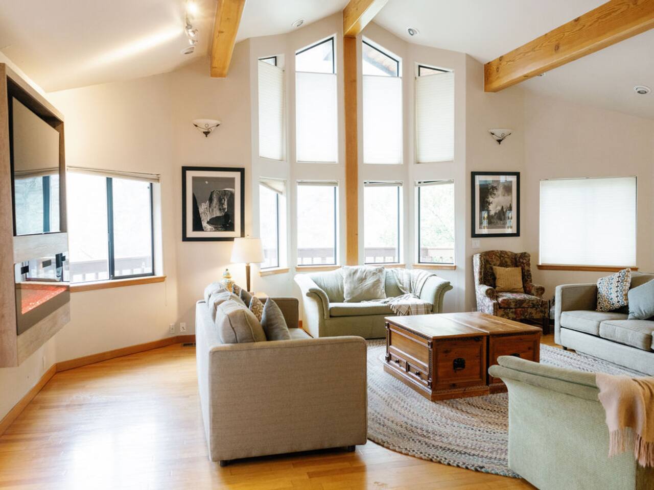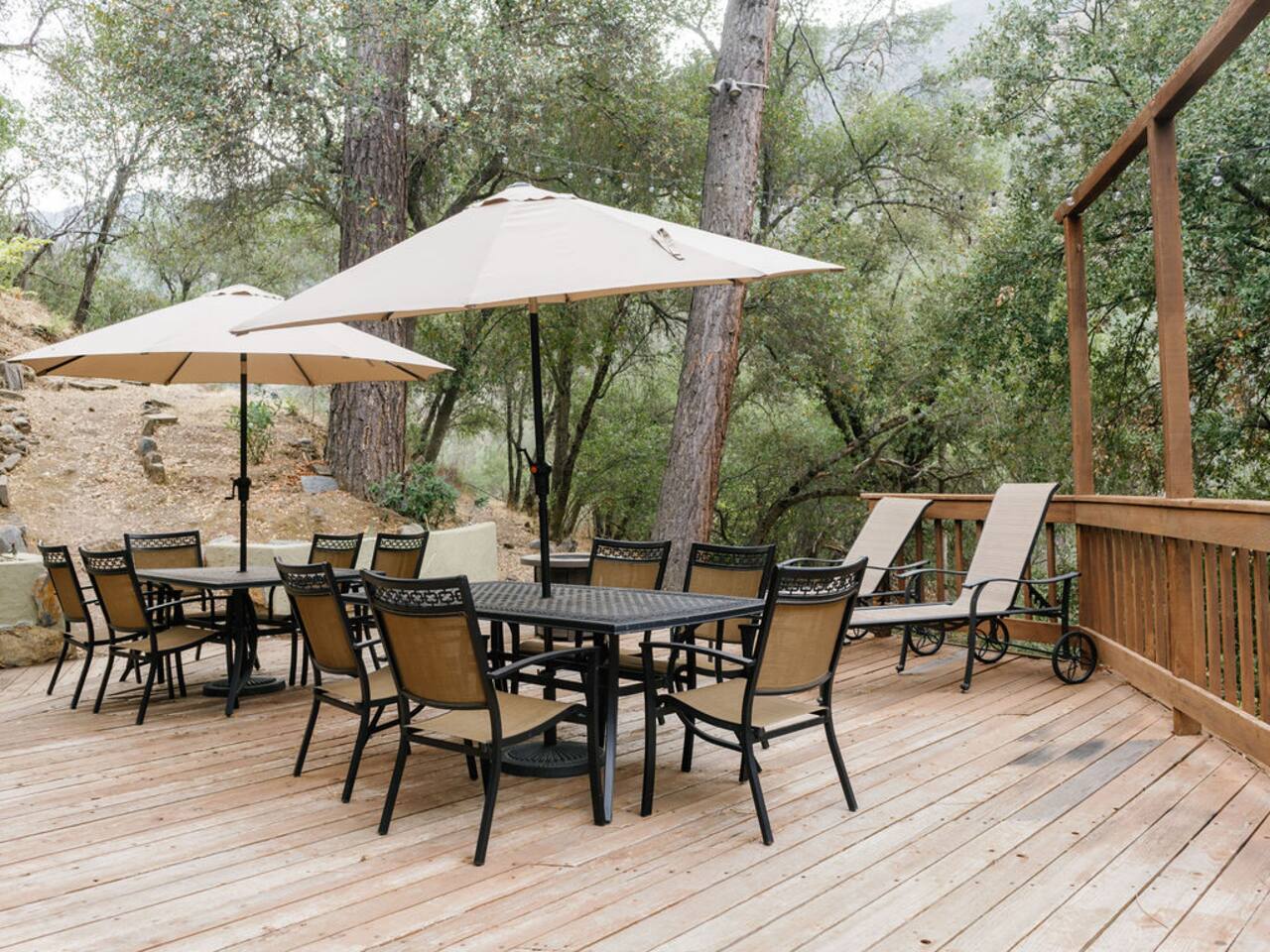 Hunter House offers plenty of room to relax, reconnect, and enjoy time in the mountains — just 10.6 miles from Yosemite National Park. The main home features four bedrooms and generous shared spaces throughout. The master suite includes a king bed, a large private bath, and access to the outdoor shower. Two additional bedrooms have two queen beds each, while the fourth bedroom features a king bed and a cozy loft. A queen-size sofa sleeper is available in the living room for additional guests. The home also includes a spacious dining area, a full kitchen, a separate family room with additional sleeper sofas, and balconies that bring you even closer to nature. A separate, private-entry unit with two queen beds and its own full bathroom is also available to rent upon request — perfect for additional friends, family, or those looking for a little extra privacy.